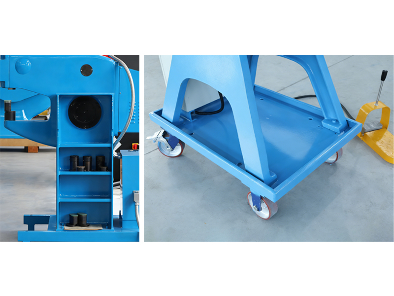 Armazéns opcionais de armário de grande dimensão matrizes e peças de reposição para mudanças mais rápidas. Rodas giratórias permitem a rápida relocação e bloqueio; a área da roda duplica como armazenamento temporário para trocas de ferramentas no local.