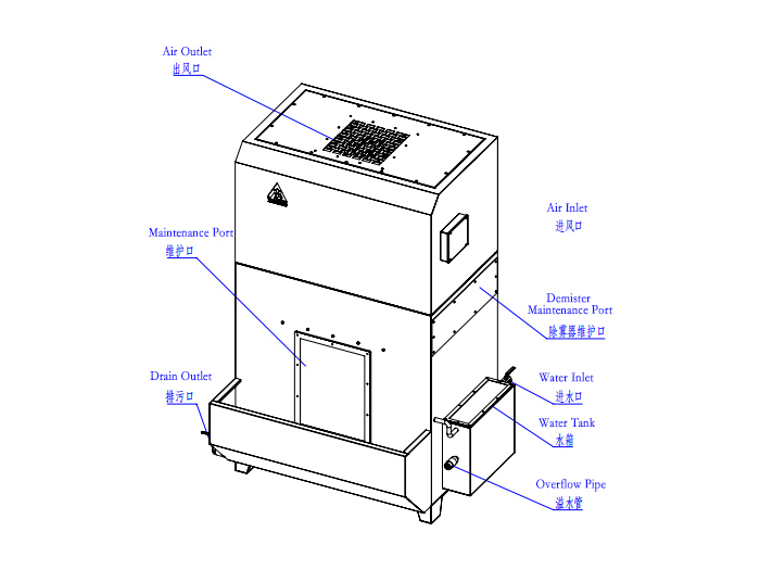 Sob a pressão negativa criada pelo ventilador, o gás carregado de poeira entra no módulo de filtração de água e entra em contato próximo com o líquido (normalmente água). Através da impactação inercial entre gotas de água e partículas de poeira e outros mecanismos de coleta, o dispositivo captura efetivamente partículas líquidas ou sólidas com diâmetros no3-30 μmgama e também remove alguns poluentes gasosos. A água é arrastada para cima pelo fluxo de gás; Em combinação com o deflector e a unidade de desminagem, ocorre a separação gás-líquido e o líquido retorna ao tanque, alcançandorecirculação de água sem bomba. O sistema alcança uma eficiência de purificação de ≥90% para partículas maiores que 10 μm.